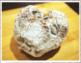 2015年1月に登場して、早くも人気No.2に輝くのが「クラプフェン」(160円)。ドイツの伝統的なおやつで、柏ではハレビノにしかない注目メニュー。パン好きの上野店長が品川にあるパン屋さんで食べて惚れ込み、販売を決めました。サイズは子どものげんこつほど、シュークリームを油でカラッと揚げたような印象です。シュガーがかかっているからすごく甘そうに見えるけれど、中はふんわりやわらか。たっぷり入ったレーズンと軽い食感がクセになる、病みつきドーナツです!